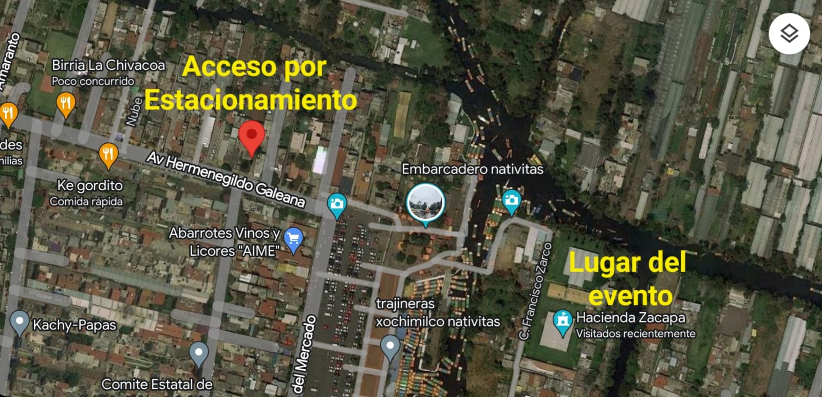 El acceso al evento para el recorrido en trajinera será desde el estacionamiento.